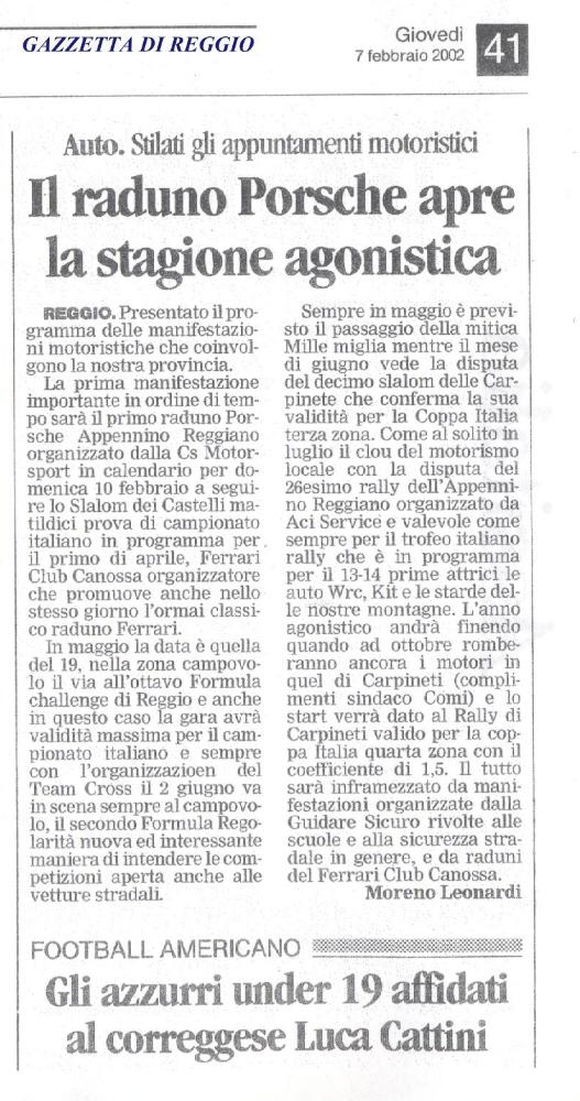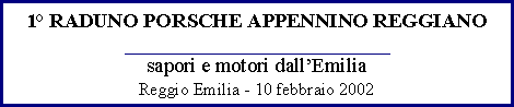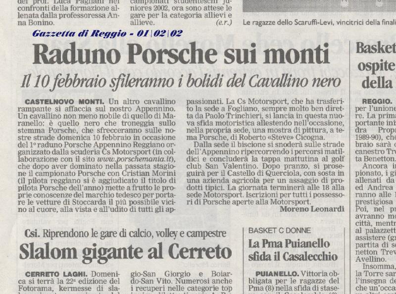 | La CIESSE MOTORSPORT di Reggio Emilia, in collaborazione con PORSCHEMANIA.IT, organizza per domenica 10 febbraio 2002, il 1º Raduno Porsche Appennino Reggiano. |