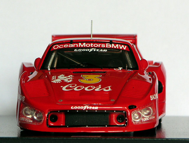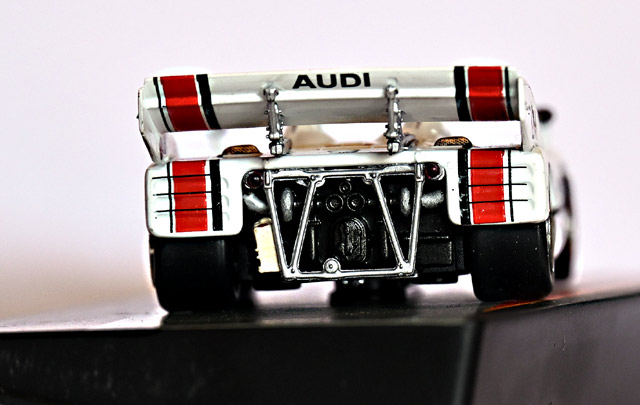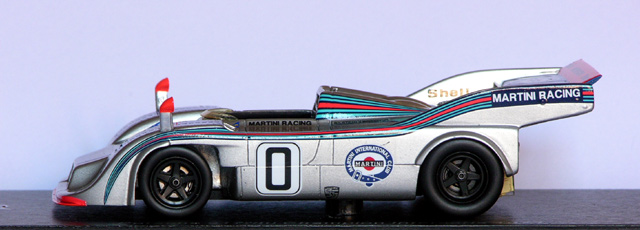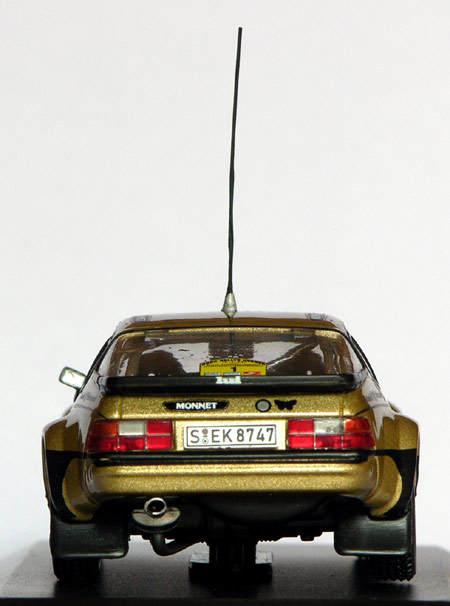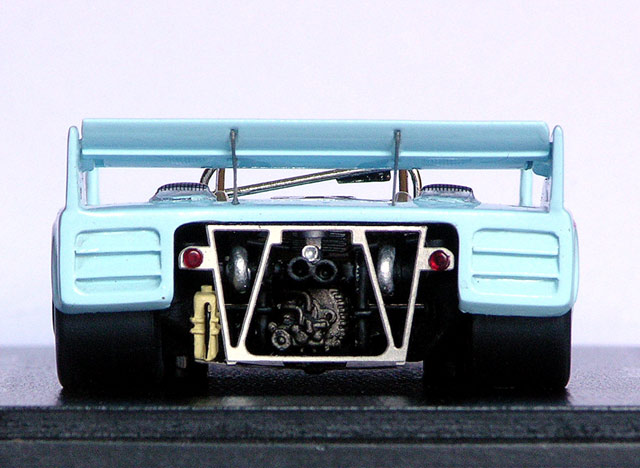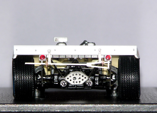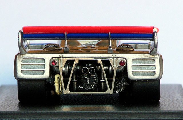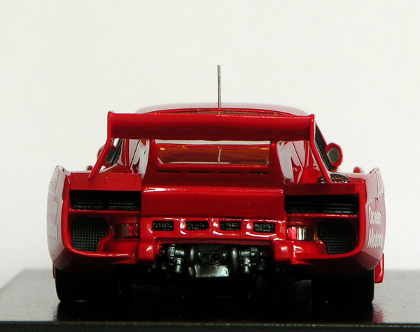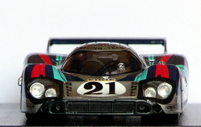 Questa è la Porsche 908/04 vincitrice al Nurburgring 1980 con Stommelen-Barth. Modellino della Best Model, che non sarebbe stato male, ma deficitario nella parte posteriore: mancavano i fanali, e gli scarichi erano della 908 aspirata. Per i fanali è stato semplice, molto meno per il gruppo turbo/scarichi, che ho riprodotto a "grandi linee" ( speriamo che Robbi non legga!!!!), compreso il telaio posteriore, anche lui bisognoso di un ritocco, e comunque solo somigliante all'originale. Scurito radiatore e colorato di argento le prese Naca posteriori...