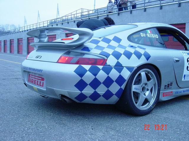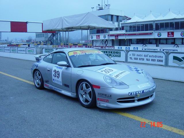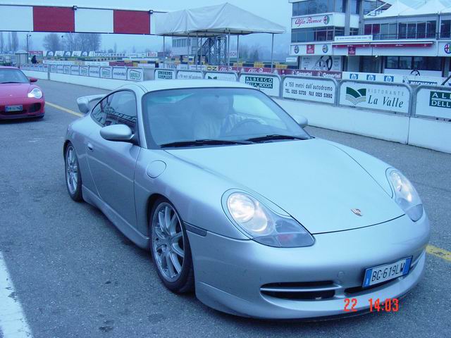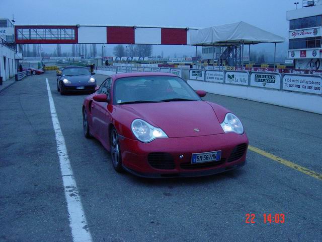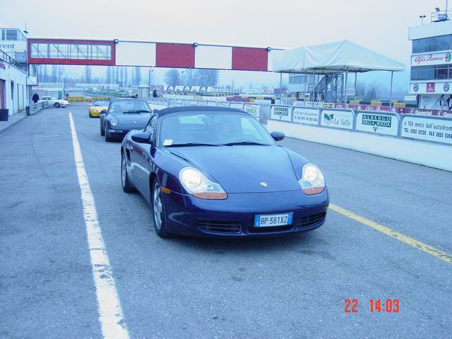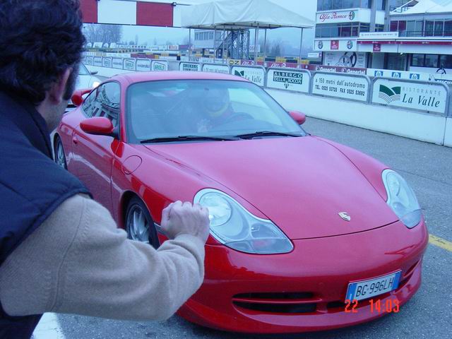 Un caloroso (e' proprio il caso di dirlo, visto il freddo becco che faceva!) ringraziamento a tutti i Porschemaniaci intervenuti ieri a Varano, per la stupenda giornata passata insieme. Un plauso particolare a Lady Kid, per aver sopportato al freddo ed al gelo, le scorribande pistaiole del suo Filippo. Cosa non si farebbe per il proprio amato! Prima di partire con la descrizione, proporrei di devolvere parte degli incassi del neonato club PiMania, all'acquisto di una Porschettina per l'amico Boxer Bart, prima che si finisca le mani, a forza di mangiarsele a bordo pista. Veniamo ai saluti. In primis, ad Alex lo Svedese (forse sarebbe il caso di chiamarlo Ice Man, per la sua grande capacita' di sopportare temperature polari), per la sua simpatia ed affabilita', con la speranza di incontrarsi presto a Bologna. Io ed il Chiacchiera, non abbiam fatto altro che parlare e fantasticare su un possibile incontro con bionde signorine delle tue parti. Quando organizzi? A seguire, l'altro bolognese, si', proprio lui, Bruno il Turbobusone, presentatosi a mattinata inoltrata, con tanto di sigaro cubano, a 'mo di talent scout, che ha contribuito non poco, a riscldare, con la sua solita simpatia, una giornata altrimenti polare. E poi, a tutto il resto della pattuglia di Porschemania: a Jack993 (Xander, o come cacchio si chiama ora!): sarebbe meglio soprannominarlo "Baby Sgommeur", vista la particolare propensione alle derapate; ad Alby GT3: gran macchina e, soprattutto, gran manico, il meglio della giornata. E' proprio il caso di dire che ha il piede pesante! ha ha ha; a Stefano GT3 (zanza?): anche lui simpaticisimmo e velocissimo con l'Elise kompressor (di nuovo scusa per le sigarette!); a Filippo, a Luca e Gio' (capitati di passaggio), a Paolone CS, ad Erri GT2, allo Sgommeur. Finalmente, ho avuto il piacere di stringere la mano, al qui tanto contestato Akuma: che dire, macchina stupenda, grande simpatia (da perfetto toscano), e gran guida. Non dimentichiamoci Cristian, Mr. M3, veramente spettacolare la sua guida de traverso, specie al tornantino finale. Allora, la giornata ha fatto emergere tutta la bonta' della GT3, magistralmente condotta da Alby, rispetto a mostri sacri come Ferrari 355, 348, 360 Modena, Lamborghini Murcielago, Chevy Corvette, Porsche varie. Veramente veloci le Lotus Elise, particolarmente adatte al tipo di circuito (quasi quasi ci faccio un pensierino!). E per finire, un grande saluto ed abbraccio, al fraterno amico Chiacchiera, sempre disponibilissimo a portarmi come zavorra, ed a sopportare le mie inevitabili crisi esistenziali. La prossima volta che ci muoviamo, basta pero' con la cioccolata, ne sto' ancora pagando le conseguenze! A proposito, scusa se t'ho fomentato troppo con la guida in pista, per poco non ci rimettevi la Cup! Speriamo solo che sia riuscito ad immortalare il bel 180° alla fine del rettilineo, con relativa fiammata dallo scarico. Beh, che dire ancora: spero di essere in pista anche io la prossima volta, magari con una bella Boxster S! Di nuovo, un salutone a tutti!