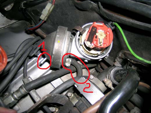 Ora qualche foto esplicativa: Ecco la foto dello spinterogeno e della vavola pneumatica che varia l'anticipo, al particolare cerchiato n°1 va collegato un tubino che si collega al corpo farfallato nel particolare 5 nella foto sucessiva. Dal particolare n°2 parte un altro tubo che si collega al particolare cerchiato n°4.