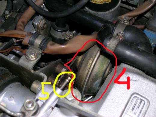 Allora molto rapidamente la "valvola pneumatica" è comunemente chiamato correttore di anticipo a depressione il nome gia dice a che serve la depressione applicata al tubo 1 anticipa al tubo 2 ritarda l'istante di accensione. Un sistema empirico ma molto pratico ed efficace per sapere se funziona o no è con il motore spento aspirare aria dal tubo 1 e osservare all'interno dello spinterogeno se la piastra sotto al distributore si muove inoltre non ci deve essere passaggio continuo di aria se così fosse la membrana del correttore è bucata e và sostituito. Il tubo cerchiato in giallo è il tubo che porta la depressione al servofreno se si buca il motore ha un funzionamento irregolare in quanto aspira aria non prevista e non "misurata" inoltre potrebbe diventare molto duro il pedale del freno in quanto il servofreno non riesce a moltiplicare la forza esercitata sul pedale Quanto al particolare 4 penso ma non sono sicuro di sapere cosa è quindi come dico sempre io "meglio far finta di essere ignoranti che aprire bocca e togliere ogni dubbio" fammi controllare poi quando ne sono sicuro ti dico a cosa serve. Quanto ai valori di anticipo ai vari regimi non li so a memoria provo a vedere se li trovo da qualche parte. Dimmi che problema hai magari ho qualche idea. Ciao Luca |