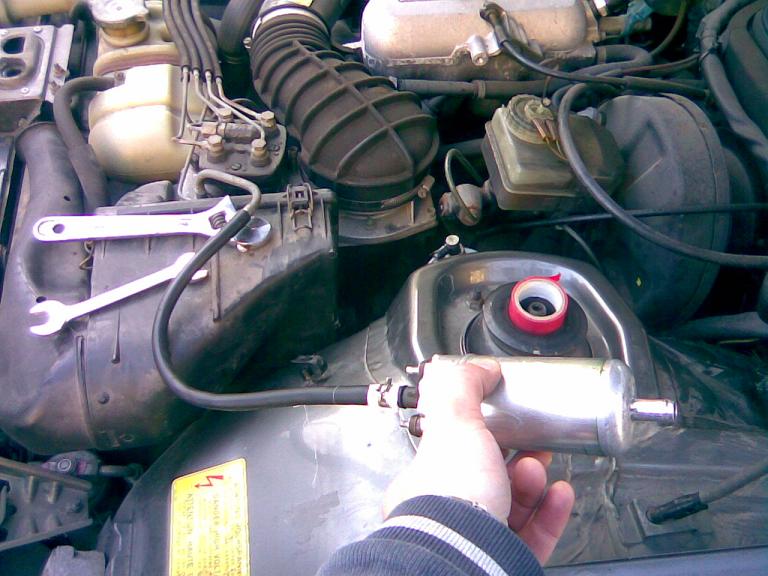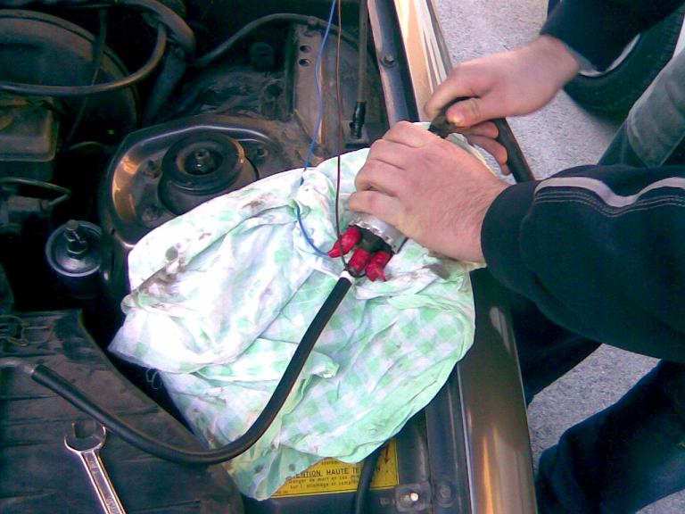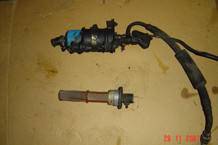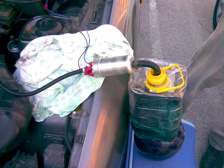 ciao ragazzi....finalmente armato di pazienza...senza meccanico..io e il caro gianluca ci siamo messi in moto per metterla in moto..e scusatemi il gioco di parole! Risulatato?? La macchina resta in moto per pochi secondi (2) e abbiam provato piu' volte...insomma sara' stata in moto sette volte per due secondi.Credo che il problema sia dovuto al tipo di pompa poco potente. Cmq adesso un Signore anzi un Benefattore mi fara' dono della pompa giusta (mitico)!! Ecco il simpatico artefatto usato per la messas in moto....unico appunto...scolava benzina dal serbatoio posteriore..dall entrata alla quale si avvita la pompa interna. per caso c'e' una sorta di reinvio che rispedisce la benza in eccesso al serbatoio???? Inoltre e' entrata in funzione la ventola...strano!!Vabe' adesso perlomeno shc eva in moto anbche se pochissimo.