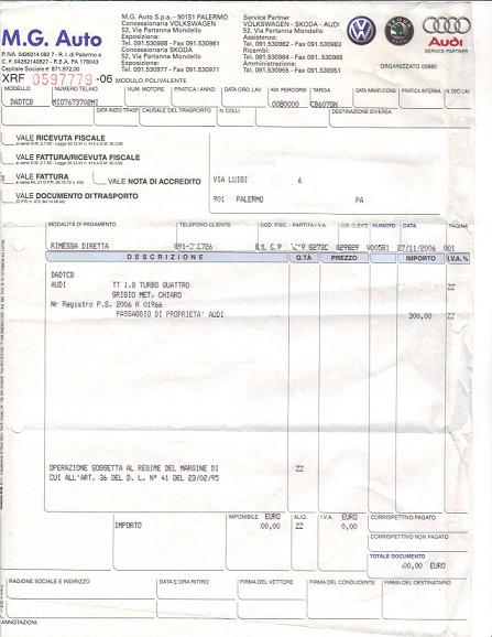 BENISSIMO, HO TROVATO UN DOCUMENTO INCONFUTABILE CHE PENSO RENDERA' CONVINTO ANCHE GENO,BENCHE' TALE DOCUMENTO PROVENGA DA ME. LA RICEVUTA FISCALE DEL CONTRATTO DI VENDITA DI UN'AUDI TT 225 CV QUATTRO PRESA USATA IN CONCESSIONARIA UFFICIALE. come vedrete il costo del passaggio e' di 300 ,quando in base ai kw sarebbe costato cca 800 euro. nno appena lo scannerizzero' lo postero' a breve,adesso devo proprio scappare. SI VIS PACEM PARA BELLUM