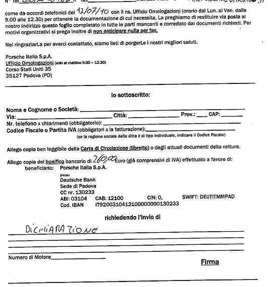 Ho richiesto a Porsche Italia il "famoso " certificato per dimostrare l'anno di fabbricazione. Mi hanno spedito questo modulo da compialre e reinviare dopo ave fatto un bonifico a loro favore di 260 euro.