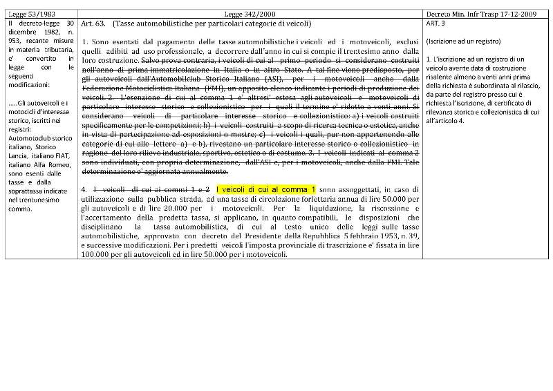 at dariodb: così sembra una discussione privata tra noi due. Io cerco di capire l'effetto della nuova norma tenendo conto di quello che si sono "dimenticati" di abrogare. IL Decreto Ministeriale a cui mi riferisco è quello del MINISTERO DELLE INFRASTRUTTURE E DEI TRASPORTI DECRETO 17 dicembre 2009 : Disciplina e procedure per l’iscrizione dei veicoli di interesse storico e collezionistico nei registri, nonché per la loro riammissione in circolazione e la revisione periodica. E' qui dove viene stabilita la soglia dei 20 anni per l'iscrizione dei veicoli ai registri storici. Una volta che il veicolo è riconosciuto storico, da parte di un registro con l'emissione di un certificato, rientra nella casistica della legge del 1983 che lo esenta dal bollo. E questo indipendentemente dalle varie casistiche previste dalle regioni. Quindi se l'intento della recente norma era quello di non concedere alle auto dai 20 ai 30 anni l'esenzione bollo, la manovra è riuscita (forse) solo per le non iscritte ai registri storici. |