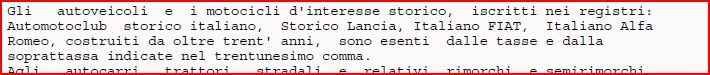 Infatti. Ma era quello che accadeva da sempre in tutte le regioni con le 20ennali, a cui era concessa l'esenzione in funzione esclusivamente dell'iscrizione A$I. La legge dello Stato si è detto è superiore a qualsiasi legge regionale, ed è per quello che nella mia regione e in tutte le altre, l'iscrizione A$I tutto ad un tratto è valsa come carta per pulirsi il chiulo.... Ora, non capisco perché in Lombardia rimanga questa eccezione, e la legge regionale si imponga a quella statale. Contento per voi ciao |