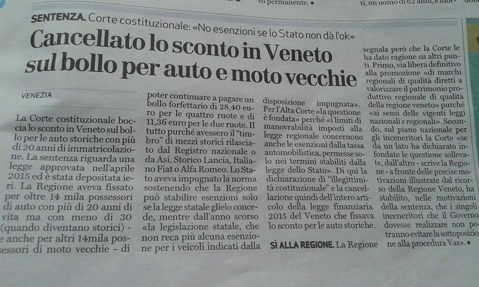 Pare ci siano novità interessanti per la Toscana... Si parla di una legge approvata a fine giugno con 60euro di forfait per le 20-30anni iscritte ASI. http://it.blastingnews.com/motori/2016/06/bollo-auto-storiche-2016-le-news-del-26-giugno-00985683.html (Messaggio modificato da bussino il 20 luglio 2016) www.xtremedrive.it --> Mettiti alla prova con i nostri corsi di guida! www.ring-speed-motorsport.com --> noleggio al Nurburgring devo aggiungere altro?
