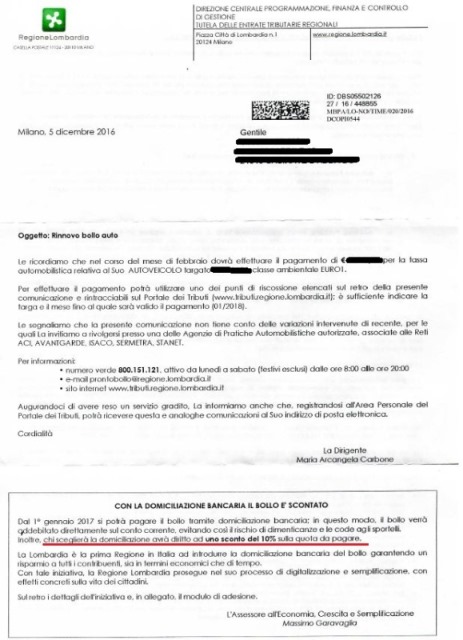 Aggiungo qualche informazione che manca in questo post. Per i lombardi è possibile collegarsi al portale tributi della regione Lombardia. Se si accede con autenticazione "debole" (username e password) è possibile consultare lo stato dei pagamenti per le targhe di proprietà ed eventualmente pagare il bollo intero. Per attivare la domiciliazione con sconto 10% è necessario accedere con autenticazione "forte". Questo tipo di autenticazione si fa con lettore di smartcard e tessara sanitaria/codice fiscale oppure con autenticazione SPID Nel primo caso serve il lettore di smartcard. Nel secondo caso si fa tutto on-line. Occorre seguire la procedura e servono 3-4 giorni Per accedere allo sconto dovete domiciliare almeno 15 giorni prima della scadenza Non c'è bisogno di recarsi in nessun ufficio (grazie al cielo) |