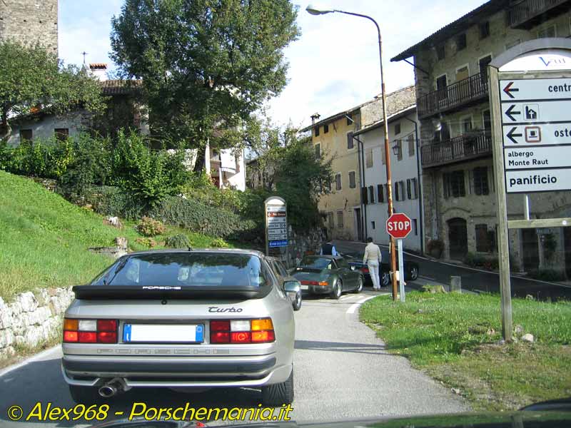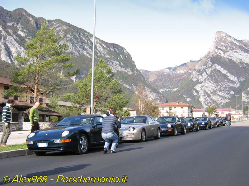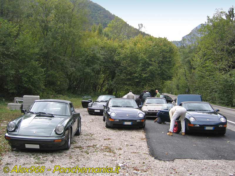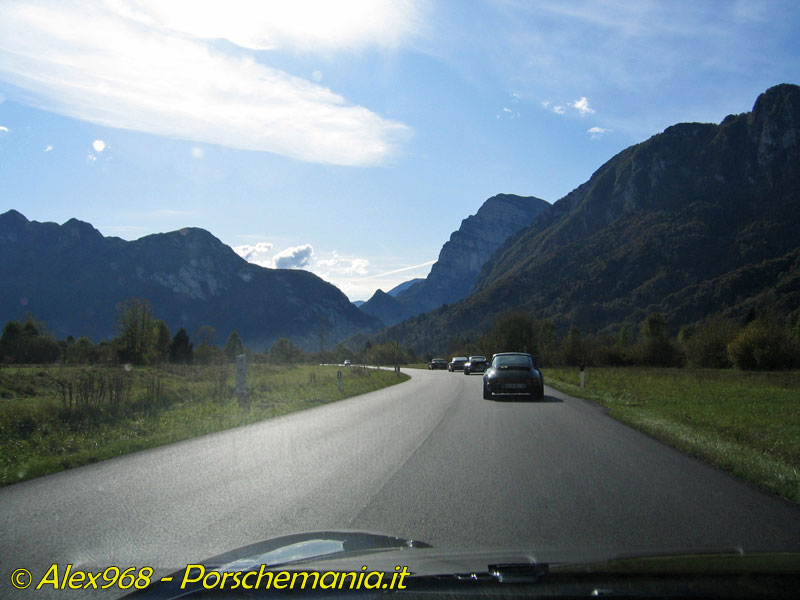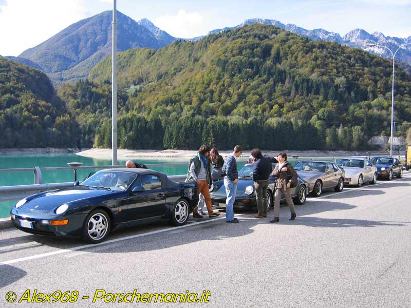 Ecco come di consueto un breve resoconto della giornata trascorsa. Desidero ringraziare innanzitutto Maurizio per avere organizzato l'itinerario ed avere tenuto per tutto il percorso la testa del gruppo. La frase "dop che sei passat del tue gomm non rest piu nient!" è stata profetica... Un grazie a Gabriele di Udine che a causa di un imprevisto ci ha atteso a Sauris al freddo per più di un'ora. Grazie ad Alessandro di Bologna per avere portato fin qui la sua 951. Un battesimo agli incontri del nostro Club che avrà sicuramente un seguito. La 931 di Andrea ha stupito un pò tutti. Altro che mezza Porsche, ha aggredito per tutto il tempo il retrotreno di chi la precedeva. Una prova da 10 e Lode!!! Gran macchina Andrea! Gabriele con la 928 ha tenuto il ritmo di montagna con gran soplesse, e che ruggito quel V8! Grazie ad Enrico, Mauro e Alessio del Gruppo Bassotti e a mio papà per avere garantito la presenza di tre AirCooled che male non hanno fatto, anzi! Ecco una breve foto-cronaca della giornata e dei suoi momenti salienti: Partiti da poco da Longarone, in coda al semaforo della Diga del Vajont. Le gomme iniziano a scaldarsi lungo i primi tornanti.