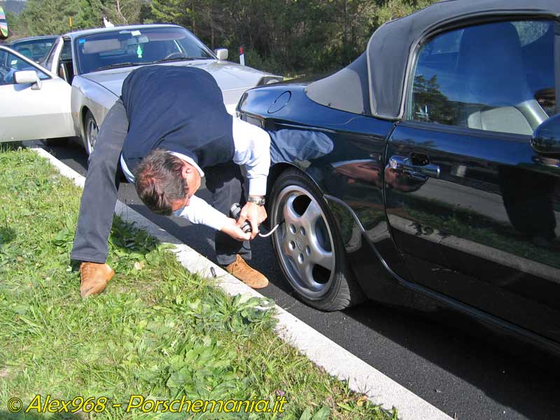...ma davanti c'è sempre lui! Maurizio con la 968 Cabrio con ruotino al posteriore. Ad alcuni balena in testa l'idea che durante la notte qualcuno abbia fatto una Macumba per farlo guidare piano, Maurizio invece con la sua prestazione fissa nuovi standard di aderenza per tale dispositivo!
