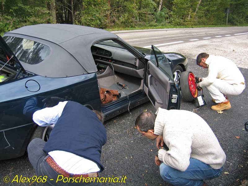 Sono attimi concitati. Il crick Porsche in dotazione sembra l'arnese per la vettura della Barbie. Con grande difficoltà riusciamo ad alzare la 968 con l'ausilio di due crick.