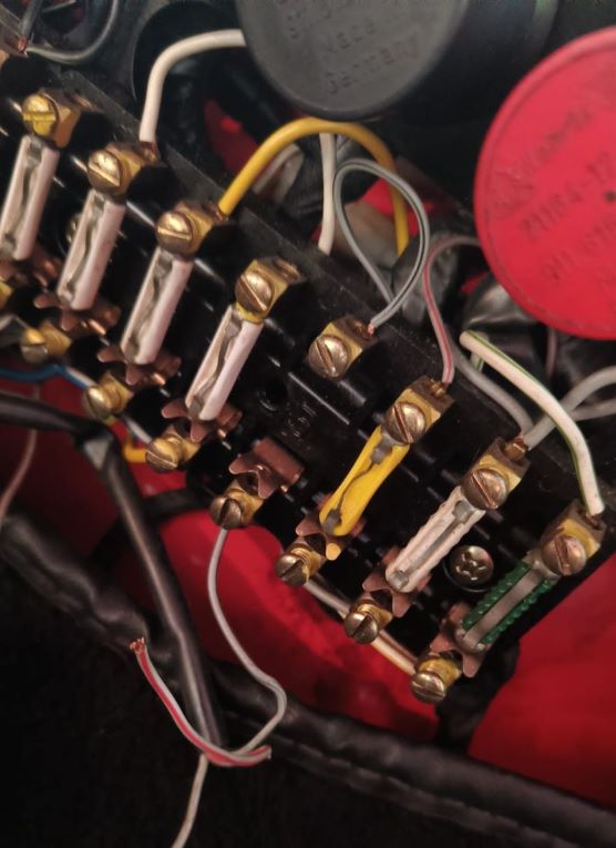 Cosi' ad occhio sembra vada collegato ad uno dei primi tre in basso, sembra di vedere un cavallotto tra i primi tre , dovrebbe chiudere il circuito col suo filo omologo biuanco e rosso superiore , se hai paura di fare dei danni usa un fusibile e fai ponticello tra il filo staccato ed uno dei primi tre morsetti in basso a destra sul quarto manca proprio il fusibile 6 cilindri...che musica.