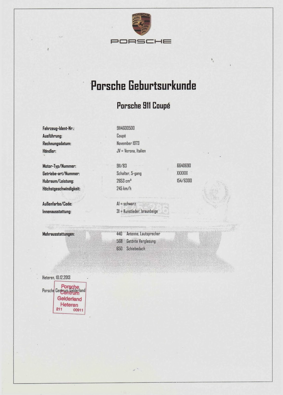 This highly desirable and increasingly collectible early 911 Carrera is offered with Austrian Einzelgenehmigung and the aforementioned Porsche Zertifikat.