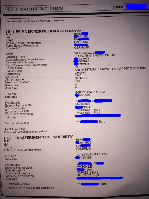 Boh....mi sembra sia scritto in italiano anche sul foglio che hai messo tu.... MILLENOVECENTONOVANTADUE immatricolazione in ITALIA !!! Targa precedente l'hai.. COPERTA !!! Paese di precedente immatricolazione... GERMANIA !!! Vuol dire che dal 1989 al 1992 l'auto aveva una targa tedesca..che è pure riportata sul foglio !! Boh .... |