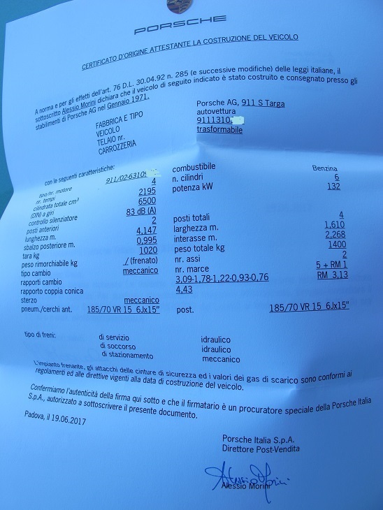 Ciao Nevio, prima di tutto complimenti per l'acquisto, bel pezzo!!! Ho letto attentamente il certificato d'origine che non riporta il colore e tantomeno la configurazione degli interni. Da cosa deduci che il colore originale era il Conda Green? Da qualche traccia? E gli interni con sedili diversi? Pensavo che questa possibilità fosse solo per le RS. Te lo chiedo perché non sono così esperto e mi piacerebbe sapere come verificare i colori. Grazie, Massimo |