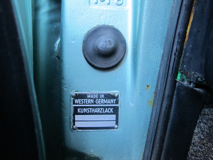 Grazie a tutti per le risposte, Riccardo mi piacerebbe sapere se la tua 911 è My 70 o 71. Massimo, il colore originale oltre alla prima pagina del "certificato di origine", come diceva giustamente Massimiliano,lo vedi riportato sulla targhetta dove è incernierata la porta lato guidatore.(Vedi foto) Nella mia si vede benissimo perchè sia la vasca anteriore (bagagliaio) che quella posteriore (vano motore) è rimasta prima vernice.Ciao Nevio  |