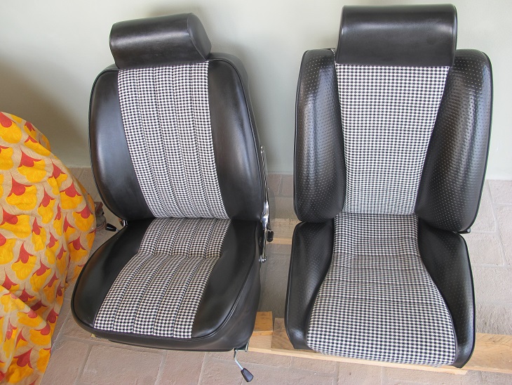 In ultimo ecco i miei sedili appena ritirati dal tappezziere, é stato sostituito solo la parte centrale perchè erano con bruciatura di sigarette.Poggiatesta,fianchi,laterali, e retro assolutamente originali.Questo è il mio motto "meglio riparare che sostituire" Ciao Nevio |
