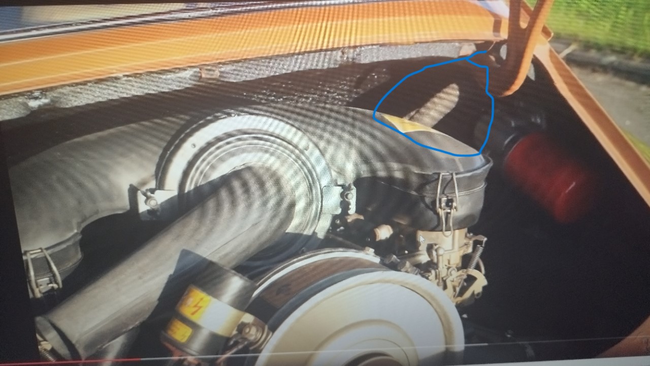 questa è un foto di una 911 serie E con motore montato ove è evidenziato uno dei due tubi dell'olio che ritengo vadano al motore e che a sua volta siano collegati al serbatoio dell'olio mediante uno dei dei passaggi evidenziati nella foto precedente.