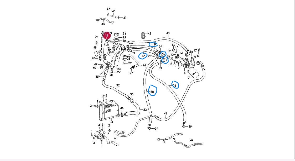 Ciao Giulio, io sarei dell'idea di ripristinare i passaggi originali e di chiudere i buchi che gli americani hanno fatto su questa 911. Monterei poi il radiatore dell'olio anteriore sotto il parafango anteriore destro inizialmente nella forma delle serpentina che ho letto sia più efficiente rispetto al classico radiatore: che ne pensi? Poi in futuro in caso di ulteriori sviluppi si potrà pensare a forme più evolute di raffreddamento dell'olio. Ora mi debbo procurare la valvola termostatica da inserire nella consolle porta filtro dell'olio in modo da poter realizzare il circuito di raffreddamento supplementare: si tratta del particolare circolettato nel disegno sottostante: Per quanto riguarda il motore non ho ancora deciso bene il da farsi: ora è completamente aperto e aspetta interventi....... a parte l'inevitabile aumento della cilindrata tu o chiunque legga, che cosa proponete in merito? Considera che l'auto sarà prettamente una stradale da divertimento