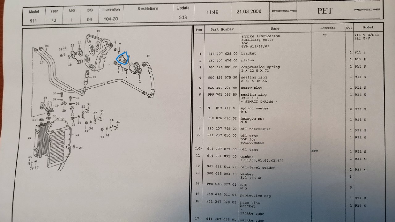 Mah, dipende da cosa vuoi fare. Tribute? Clone? Restomod? Bespoke? E di che auto? Per la meccanica, dire che avrà bisogno del radiatore è riduttivo visto che quello sul motore serve praticamente solo al minimo, a meno che tu non abbia un polmone da 150 cavalli. Negli USA i regolamenti sono più liberi e i preparatori pragmatici, non si fanno grandi problemi a saldare rinforzi, aprire buchi o a far passare i tubi direttamente nell'abitacolo. Noi europei in genere siamo un pò più raffinati, considera che porsche nel manuale della RSR ti mostrava la posizione dell'accendisigari. Scegli tu l'approccio che ti è più affine. Non ho tempo di fare le foto del pet e ridimensionarle per inserirle, se vuoi ti giro via mail tutto il pdf, comunque la tavola 104-20 mostra le linee dell'olio del 2.4S del '72 e come inserire la termostatica. Alcuni dicono che per uso pista porsche inseriva la preshona e toglieva la termostatica mentre la lasciava per i rally... Non so, io l'ho lasciata perchè è fondamentale per gestire la temperatura del motore nell'uso stradale, ti consiglio di procurartene una. La tua ricostruzione del passaggio dei tubi è giusta (sul pet è scritto dove vanno i tubi) ma è per un'auto stradale, su un'auto da sport le due curve a 90 gradi cerchiate in azzurro possono anche stare chiuse (non hanno il numero perchè fanno parte della carrozzeria). Pure il buco che hanno aperto sulla parete del vano motore non serve, le linee dell'olio per i radiatori frontali partono (e arrivano) dal serbatoio che è già esterno al vano motore. Ciao |