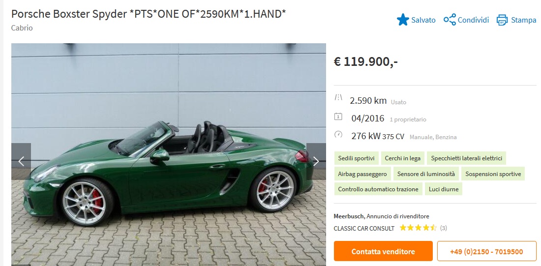 Aspetta qualche mese che presentino la nuova 718 Spyder....in questo modo le 981 Spyder si svaluteranno un pochino e sarà il momento giusto per comprarla. Vedrai che a 75-80 ci arrivano quando uscirà la nuova e poi non si svaluteranno più. Per me è la Porsche cabrio più bella dell'era moderna e spero un giorno di portarne a casa una, ora le varie tasse mi fanno desistere ma tra qualche anno quando il superbollo sarà meno caro mi piacerebbe prenderla In Germania se guardi sul sito mobile.de ce ne sono parecchie in vendita e tutte con pochi km, buona caccia Organizzatore “Raduno Porsche Varano”, vi aspettiamo il 22/06/2019 per la 5* Edizione (Instagram e social network)