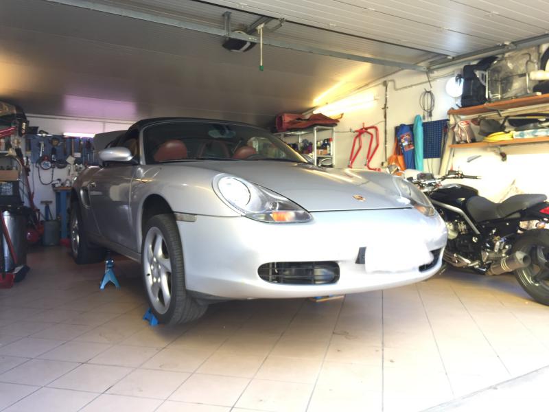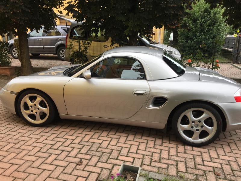 Ciao a tutti, mi sono da poco presentato nella sezione di benvenuto, e da pochi giorni sono diventato possessore di una bellissima Boxster 2.5 my'97 color argento, con interni in pelle rosso Cartier, 140000 km, già iscritta ASI. Ha una discreta dotazione di optional, assetto sportivo (cod. 030), sedili riscaldati, computer di bordo, traction control, hard top e altro che ora non ricordo. Per ora ho fatto solo 200 km ma devo dire che è veramente stupenda da guidare, sia con capote aperta, sia chiusa; l'hard top invece non mi ha entusiasmato...essendo un corpo rigido separato dalla carrozzeria sulle sconnessioni fa un sacco di rumore, lo userò poco secondo me! Ora monta i fari posteriori a led, fortunatamente ho anche i fanali originali, che sostituirò. Altre parti non originali sono i fari e le frecce bianche anteriori della my2002, sull'argento stanno bene, anche qui ho gli originali. Scarico in acciaio inox, gran bel sound ma come letto qui sul forum anche la mia ha una fastidiosa risonanza a 2500 giri circa... come sopra ho anche lo scarico originale. Cerchi da 18" della S più 17" originali. Radio touch con navigatore, per me orribile, sarà una delle prime cose che rimetterò originale (Becker CDR21). Durante l'inverno ho intenzione (oltre a ripristinare i pezzi originali) di effettuare un mega tagliando, compreso smontaggio cambio per controllo IMS e sostituzione paraolio albero motore, dato che sotto al motore c'è una gocciolina che spunta. Ovviamente darò una pulita e una cotrollata a tutto. Tutti questi interventi li farò io nel corso dell'inverno, farò un sacco di fotografie in modo da tenere tracciato ogni intervento, se vi farà piacere metterò le foto man mano che avanzo con i lavori! Per ora ho solamente queste foto