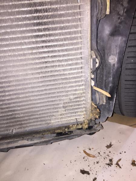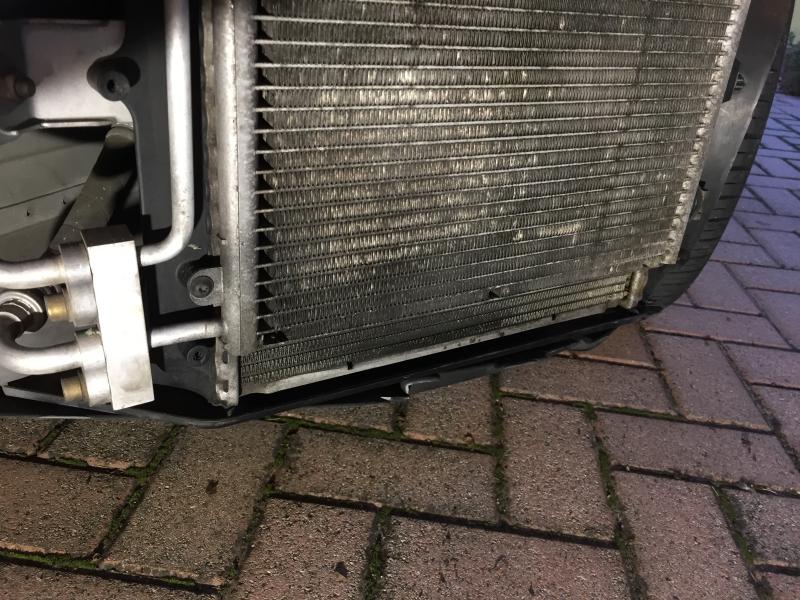 Ciao a tutti! Da qualche giorno avevo notato sul pavimento del garage una chiazza di liquido in corrispondenza della parte anteiore della macchina, zona sinistra.. mi sono così deciso ad indagare sula provenienza di quella chiazza di liquido chiaro.. Essendo solamente poche gocce si fatica a capire il colore. La zona è esattamente sotto al radiatore Sx, il che mi porta a pensare che possa essere liquido del radiatore, ipotesi confermata controllando il sottoscocca e trovando qualche goccia esattamente al di sotto del radiatore, sulla paratia inferiore. Che gioia. Vabbè meglio che me ne sia accorto ora per tempo piuttorsto che bollire tutto quest'estate, d'altronde ha quasi 25 anni, sono cose da mettere in conto. Un paio di orette di lavoro e si arriva a questo punto
