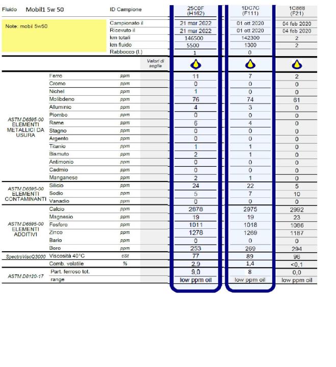 Visosità crollata nonostante i pochi km fatti (purtroppo ho disponibile solo la viscosità a 40°C ..) Additivi ancora presenti in larga misura. Pochissimi elementi metallici da usura (il molibdeno è già presente nel'olio nuovo, probabilmente è un componente stesso dell'olio). Più che i valori in sè va guardato il loro trend |