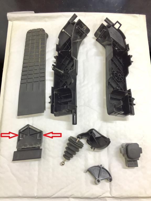 Una volta rimosso il gruppo ho iniziato a ispezionarlo per capire la provenienza del gioco; la parte mobile del pedale (quella su cui si poggia il piede per intenderci) è composta da due parti collegate tra di loro con un incastro, con il tempo hanno preso gioco causando il problema da me lamentato (zona "lasca" frecce rosse nella foto)