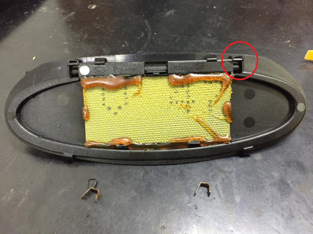 Anche se in origine non era presente ho preferito lubrificare con del grasso apposito perni e snodi, male non fa anzi. Il rimontaggio è un pò complicato, specie per il corretto posizionamento del cavo, ma con un pò di pazienza tutto torna a posto. Altro lavoretto che mi ero ripromesso di fare riguarda la sostituzione delle alette dello specchio di cortesia nelle ante parasole; rimanevano a penzoloni a causa della rottura del fermo per la molletta che avrebbe dovuto tenerlo in posizione aperta o chiusa; si notano le mollette uscite dal loro alloggiamento