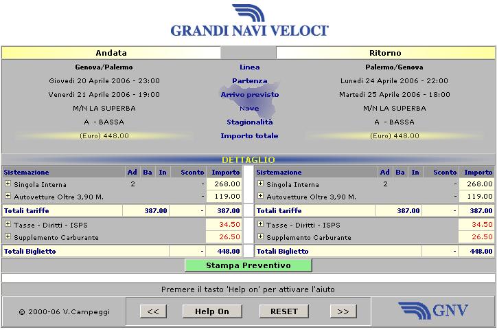 Inizio il 3D ufficiale riportando le utilissime indicazioni scritte sull'altro 3D dall'amico Giorgio...venghino siorri venghino!!! Per i milanesi (e non) che partirebbero da Genova il giovedi 20/04/06 e ritornerebbero da Palermo il lunedi 24/04/06 (il 25 sera a Milano)le tariffe 2006 del traghetto della GRIMALDI GROUP, per ogni persona, e per ogni tratta, Genova-Palermo sono le seguenti: CABINA DOPPIA INTERNA 111,00 CABINA DOPPIA ESTERNA 127,00 SUITE MATRIM. ESTERNA 137,00 AUTO OLTRE 3,90 METRI 119,00 TASSA ISPS PASSEGGERO 10,00 TASSA ISPS AUTO 12,00 Facendo le dovute somme, si vede che la spesa per DUE PERSONE, ANDATA E RITORNO è: INT.DOPPIA =(111+111+119+10+12)x2=363x2= 726,00 EST.DOPPIA =(127+127+119+10+12)x2=395x2= 790,00 SUITE EST. =(137+137+119+10+12)x2=415x2= 830,00 Naturalmente, sempre per due persone, vanno aggiunti i costi di almeno 4 colazioni + 4 pranzi da consumarsi sulla nave. Poi va aggiunto il costo della notte da trascorrere in albergo a Palermo la sera dell'arrivo + le 2 cene dell'arrivo e le 2 cene della partenza. Finalmente possiamo aggiungere ora il costo del raduno (2 persone + 1 auto) che attendiamo di conoscere dagli organizzatori. Ma chi sono al momento gli interessati? Riguardo al costo, come indicato da Umberto, è di € 320 per il conduttore e di € 300 per il passeggero, a cui devono aggiungersi i costi aggiuntivi per "pista" (eventuale) e per notte in più... Ninuzzo } Vivi come se dovessi morire domani...pensa come se non dovessi morire mai!