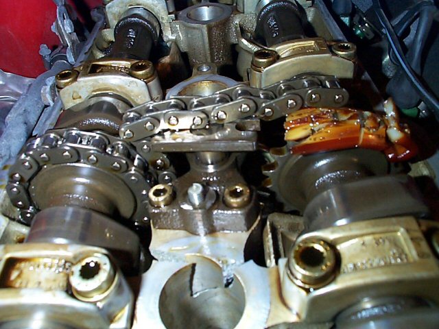 Nei 944S e S2 la cinghia di distribuzione trascina unicamente l'albero a camme lato valvole di scarico; l'altro è mosso da una catena che ingrana sui denti di una corona ricavati a metà di entrambi gli alberi, tra il secondo e terzo cilindro; la catena è tenuta in tiro da un tensionatore che sfrutta la pressione del circuito di lubrificazione dell'olio; se cede il tensionatore per un qualsiasi motivo, di solito la catena salta e può sgranare i denti delle corone degli alberi a camme; in più si piegano solitamente le valvole; se poi va di sfiga guarda cosa succede... anche il blocco della testata potrebbe saltare.