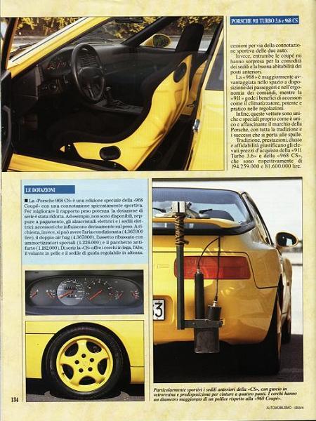 su Automobilismo di ottobre 1993 (è l'unica prova su strada di una rivista italiana che parla della 968CS) non si fa riferimento tra i (pochi) accessori menzionati a sedili sportivi. Si potrebbe desumere che l'unica possibilità è, appunto, quello a guscio. Ma lo stesso articolo parla di regolazione in altezza. Cosa che sulla CS con sedili a guscio non esiste.