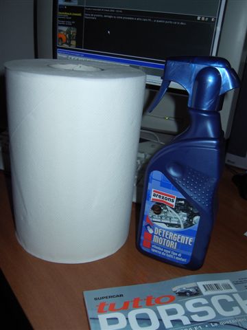 Per quanto riguarda la pulizia del motore non c’è molto da dire, è sostanzialmente olio di gomito. Come attrezzatura lasciamo lavorare molto la nostra fantasia,pertanto · Spazzolini con setole in nylon (da denti) · Pennelli di varie forme e misure (quello curvo è utilissimo) · Una lampada · Un po’ di aria compressa · Rotolone assorbente · Prodotto per la pulizia del motore(quello della foto nel mio caso) · Diluente nitro (no su parti plastiche) · Anticalcare (su parti metalliche sebbene in genere non danneggi le parti in gomma e plastiche) · Grasso e Olio spray · Olio di gomito (non reperibile in commercio) Il prodotto deve essere sgrassante ,non deve alterare la consistenza dei tubi,plastiche e parti delicate e ,evaporando,non deve lasciare residui od aloni. Noi abbiamo provato col prodotto per la pulizia del motore dell’arexons che ed è stato piuttosto efficace anche per le parti difficili ma credo che in commercio se ne trovino di svariate marche con prestazione più o meno simili. Basta spruzzarlo sulle parti che si intende pulire attendere qualche minuto(ma non troppo altrimenti si asciuga) e poi passare tutto col panno carta per asportare lo sporco. Uno spazzolino con setole in nylon è l’ideale per le parti più difficili da raggiungere,così come i pennelli di varie forme e dimensioni. Le parti facilmente asportabili conviene farle al difuori del vano motore se non altro per non far colare lo sporco all’interno sporcando magari ciò che ancora non lo era. Per le parti che il prodotto generico non riesce a pulire magari perché si tratta di olio bruciato o incristazioni di calcare occorre procedere in altro modo. Il diluente nitro è molto buono per gli oli bruciati però è estremamente aggressivo per le parti plastiche quindi prima di passarlo prendere qualche precauzione e coprirle oppure testarlo prima. (non è istantaneo , quindi se cade una goccia e la si asciuga subito non fa danni ma meglio evitare) L’anticalcare (quello per pulire i fornellini da cucina è ottimo) va benissimo per levare quelle incrostazioni bianche spesso ostiche da levare in altro modo. Quando lo acquistiamo meglio prenderne uno con una concentrazione acida abbastanza alta : 15% o più,quello al 5% è troppo delicato. Alla fine,poiche ormai avremo rimosso quasi tutti i lubrificanti sarà opportuno rimetterli dove servono ed in particolare alle erticolazioni dell’acceleratore e ai cardini del portello compreso il sistema di sgancio. Un buon pulisci contatti è opportuno per la scatola fusibili-relè:protegge dall’ossido e ovviamente pulisce risparmiandoci quei fastidiosi problemi elettrici che con gli anni affliggono le nostre bimbe. Noi abbiamo impiegato un paio d’ore in tutto per un risultato abbastanza apprezzabile.