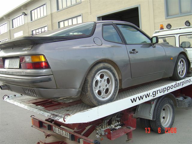 La storia !! Una banale ricerca conclusa con amore a prima vista. Be ero uscito per visionare un 928 a Frosinone veramente bello le foto le potete vedere sul forum peccato prima serie e un pochino caro 7500 Nella stessa zona un amico mecca mi aveva detto che in un conc aveva visto una 944 abbandonata e messa male ci sono andato deciso a prendela se a buon prezzo per ricambi anche perchè cercavo un famoso parabrezza per la mia 924 aspirata. Appena vista sono rimasto di sasso mi aspettavo un ferro invece ecola è come la vedede . Presa senza chiedere come. Decisamente per quatto euro. L'auto non partiva e trasportata da un elettrauto poco distante (un furbetto che vi raccomando per la sostituzione pompa benza 130 € mica cotica) la pompa ho usato una della 924 turbo va bene. L'auto ora è a casa pronta per una sistemazione generale . Per primo la cinghia di distribuzione visto che ne ho appena rotta una alla Gamma. Tony