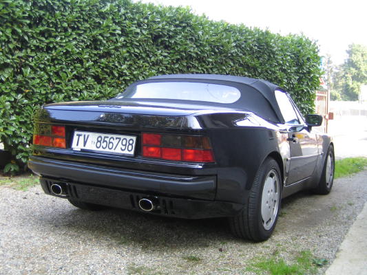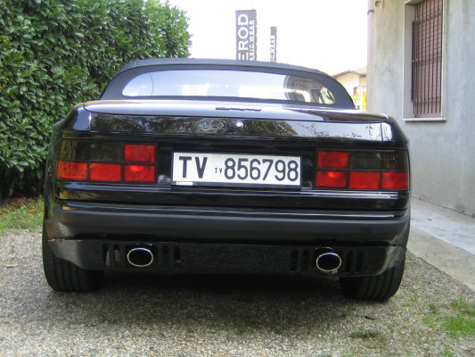 A meno che... Gigio non abbia "inventato" uno scarico tutto suo, credo che il secondo scarico sia decisamente finto. Se non lo è, ti prego Gigio, spiegaci la modifica. Che nessuno me ne abbia, per carità. Ma lasciamo perdere per un attimo tutte i dogmi sull'originalità, le nostre transaxle, che lo vogliamo o no, sono auto che si prestano tantissimo per il tarocco. Purtroppo è molto fine la linea che c'è tra una vettura elegante e una assolutamente irriverente. Questa Cabrio, nonostante le modifiche, appare comunque ben equilibrata, anche se, per come la vedo io, rimane decisamente al limite della sobrietà. Bella l'idea dei due scarichi, ma pesante quella minigonna che mi ricorda molto quei vecchi kit per taroccare le 924 aspirate. Comunque a parte le mie opinioni, che rimangono mie of course, Gigio mi dà l'impressione di un appassionato preciso e attento nei particolari. In ogni caso, quindi: Complimenti!!! State in pista!