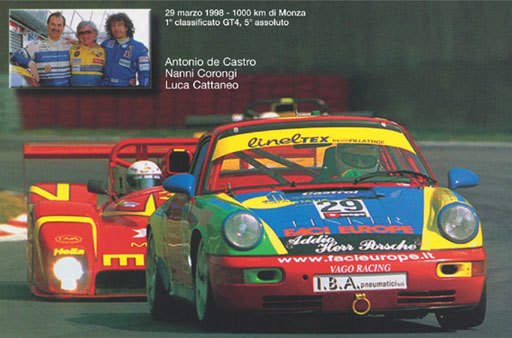 il 2/3 novembre 1996 ho partecipato al Santa Monica di Misano ad una gara del Campionato Internazionale Durata con un 944 turbo cup (di base) pesantemente preparata ed evoluta dal team Orlando (nuovo cambio con prima in basso,alleggerimenti e pesi spostati sul posteriore, cerchi e gomme di dimensioni più grandi, intercooler maggiorato ed elettronica modificata, affinamenti aereodinamici, ecc.ecc, ) di chiara ispirazione 968 turbo rs Risultato: 3° classificati, ma si poteva fare meglio. Il potenziale della vettura era elevato e c'era margine di ulteriore sviluppo. Peccato che poi i programmi si sono indirizzati su altri modelli |
