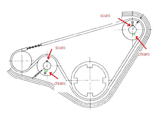 Questo forum è magico. Grazie a marco ho riflettuto sullo schema che avevo gia visto tante volte sul manuale, ma siccome è piccolo non lo vevo mai osservato bene come oggi quando ristuzzicato da marco ho incominciato ad osservarlo attentamente e come potete notare dall'immagine le due sedi che ho sottolineato di verde sono chiare e quindi vuote, mentre le altre sono scure e quindi ci va la chiavetta. Osservandolo attentamente il contralbero di sinistra viene montato al contrario di quello di destra, che ha la chiavetta in coincidenza dello zero. Risolto il problema. Il motore è nouvo e fila che è una bellezza, non mi ricordavo che tirasse così tanto o forse èra messo gia malino prima che si fermasse. Bo! Comunque sono felicissimo, non mi rimane che sostituire i distanziali che ho montato sul posteriore perchè strusciano le ruote sui parafanghi e poi ..... iscrizione al registro transaxle, raduni e pinino pianino sostituisco anche i freni e ammortizzatori. Grazie ancora! 550 Spyder ... un sogno diventato realtà che fa sognare da 50 anni