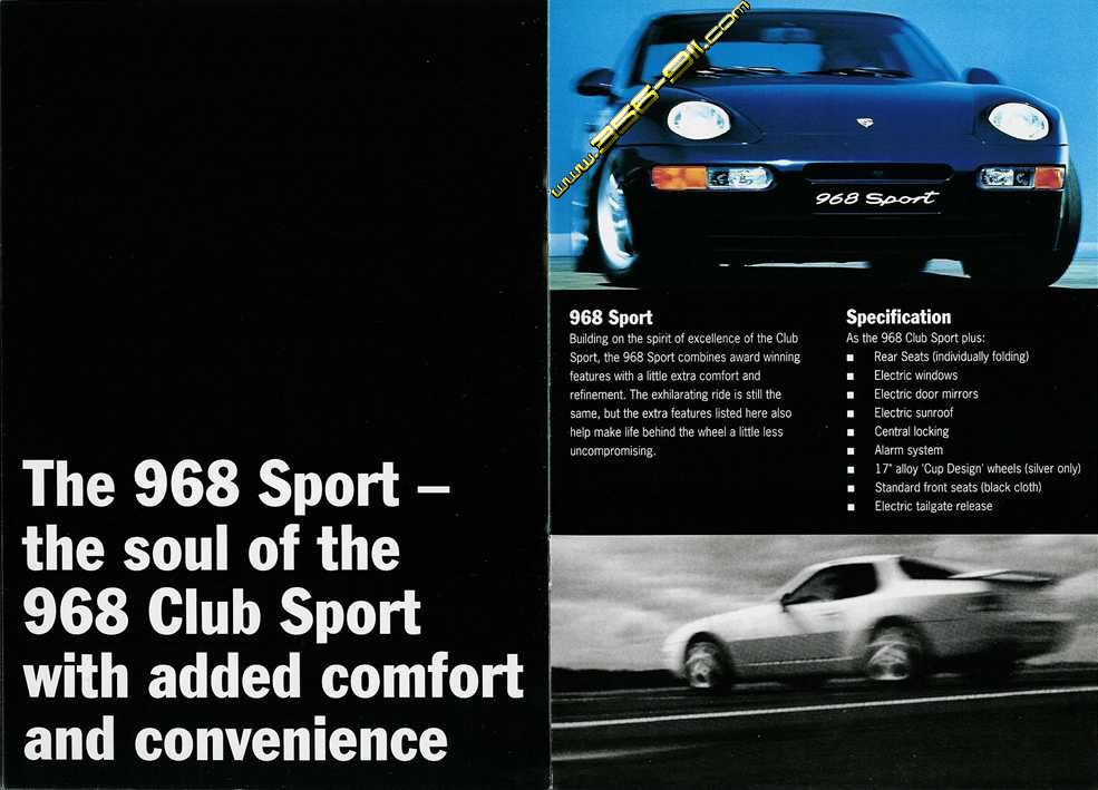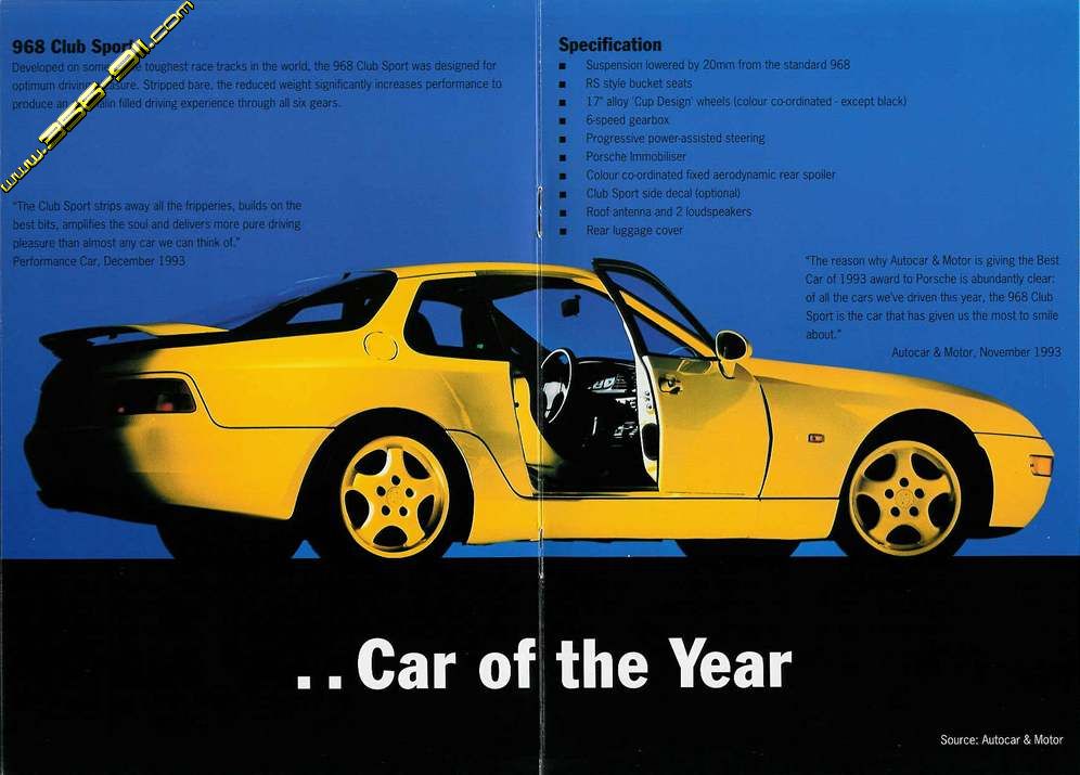 Ho ritrovato questi articoli del 1993 sulla 968... come cambiano i tempi!! "The reason why Autocar & Motor is giving the Best Car of 1993 award to Porsche is abundantly clear: of all the cars we've driven this year, the 968 Club Sport is the car that has given us the most to smile about." Autocar & Motor, November 1993 http://www.356-911.com/post1974/brochures/968brochure/5cover968opt500.jpg http://www.356-911.com/post1974/brochures/968brochure/3cover968opt500.jpg http://www.356-911.com/post1974/brochures/968brochure/4cover968opt500.jpg http://www.356-911.com/post1974/brochures/968brochure/6cover968opt500.jpg http://www.356-911.com/post1974/brochures/968brochure/7cover968opt500.jpg Ciao |