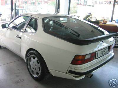 Intendevo montare distanziali oltre 5mm. sull'anteriore e 17mm. sul posteriore (misure raccomandate da Porsche)... oppure montare cerchi di misura non prevista dalla casa. La 944 bianca fotografata ha una carreggiata posteriore visibilmente eccessiva (la ruota tocca sul parafango). Porsche consiglia di mettere barra antirollio ove si montino i fucinati 8Jx16" con 225/50 16 su asse posteriore. |