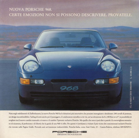 Non e' vero ! La 968 costava meno della 944 avevano ribassato il prezzo apposta per venderne di piu',ma cosi non e' stato ! Anche se della 944 aveva in piu':il vario cam e i due airbag e catalizzatore e un cambio a 6 anziche' a 5 marce ! Comunque ancora oggi nessun tecnico riesce ad azzerare le vibrazioni di un quattrocilindri montato longitudinalmente per di piu' ben fissato ad un tubo transaxle che va dietro ! Per di piu' la 968 ha due contralberi per ridurre le vibrazioni quasi a zero! Ma se uno e' abituato al motore Boxer per di piu' a 6 cilindri ( neanche 4 tipo Subaru ) e per di piu' " montato fuori dal balcone di casa " come sulla 911 , e' chiaro che un 4 Quattro Cilindri lo sente vibrare ! P.S. e' noto tutti che gli americani NON possono guidare le macchine con il cambio a " manico". Andrea 968. Mai provato un furgone 2.5 aspirato FIAT del 1991 quanto vibra il volante ? Vai piano ! Dove vai ? Resta dietro ! Frena !!