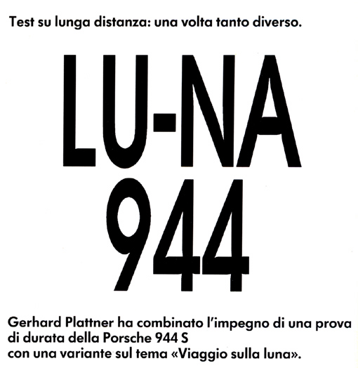 All'epoca fu il più lungo test di durata a cui fu sottoposta una vettura di serie nella storia dell'automobile: esattamente 258 giorni. Circa il motivo per cui la Porsche fece svolgere il test ad utenti normali, l'ufficio stampa pubblicò: " il motivo per noi è evidente, i collaudatori di fabbrica, per la loro sensibilità professionale nei confronti del motore e della vettura, hanno quasi inconsciamente la tendenza a risparmiare la vettura stessa quando nè avvertono i punti deboli è cio è sconsigliabilite per un test che sia realistico ". La Pirelli sottopose allo stress di questa prova il suo nuovo pneumatico ad alte prestazioni P 700 e l'invernale 160-2, mentre la Shell derivò importanti indicazioni per il suo olio motore TMO, olio di primo equipaggiamento delle vetture della casa di Stoccarda. La frase che pronunciò Juan manuel Fangio a fine prova, scendendo dalla vettura ai tanti giornalisti presenti, e riportata su tutti i giornali fu : " la 944 S è atterrata. L'operazione luna è stata coronata dal succcesso " lamps asinus asinum fricat