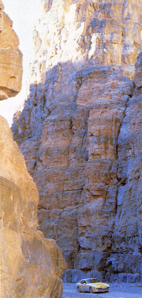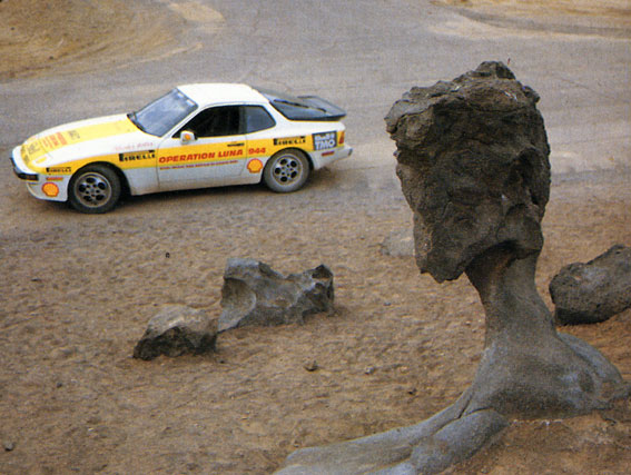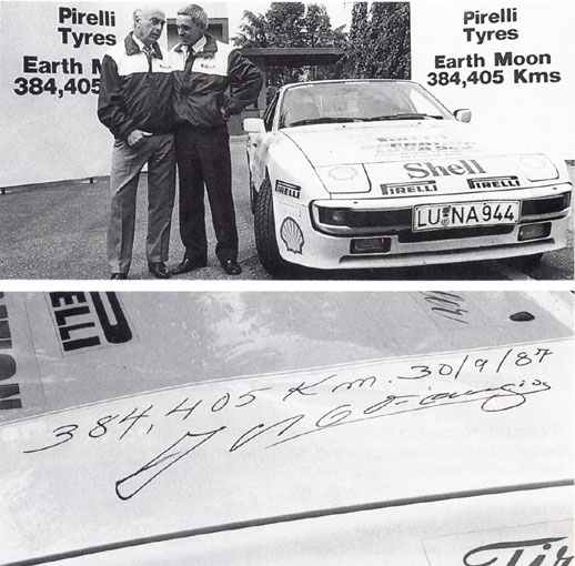 dalla neve alla polvere del New Mexico dopo aver scorazzato in America in lungo e in largo, il 944 S si imbarco su di un cargo aereo e viene portata in Europa, dove continua senza sosta a macinare kilometri, andando da Capo Nord ad Istambul per autostrade e statali. l'ultimo breve turno di guida lo fece juan Manuel Fangio, testimonial illustre, che arrivò al grattacielo Pirelli, il Pirellone come lo chiamano i milanesi, dopo che la 944 S aveva percorso esattamente km. 384.405 pari alla distanza dalla Terra alla Luna in 3292 ore, facendo anche 3247 km. al giorno ! alla velocità media di kmh. 116,00 consumando negli States 9,1 litri per 100 km. e 12,8 litri in Europa.