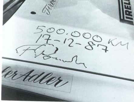 notate la targa: per avere questa targa la 944 S fu immatricolata nella cittadina di Ludwigshafen Juan Manuel Fangio con Gherhard Plattner e il suo autografo sul cofano e poi siccome era stato raggiunto il traguardo kilometrico ben 97 giorni prima del previsto, il prof. Bott, responsabile di Weissach, particolarmente lusingato del risultato, dispose che la vettura continuasse il suo andare, fino al raggiungimento dei km. 500.000, cosa che puntualmente avvenne. 20 anni fa è così che si facevano pubblicità. lamps asinus asinum fricat