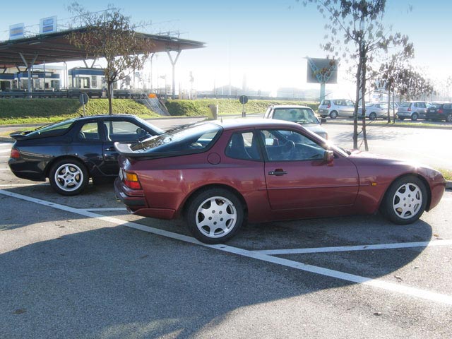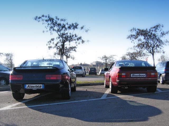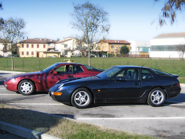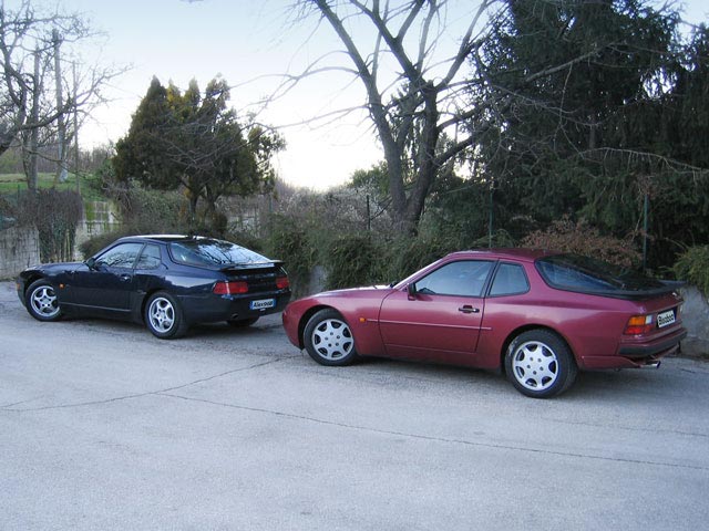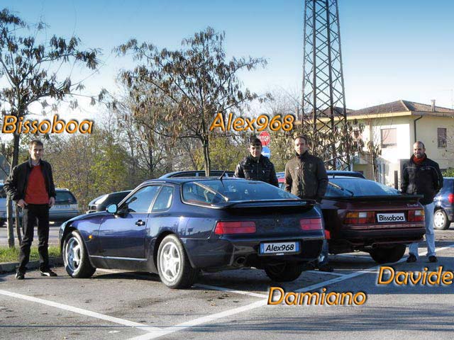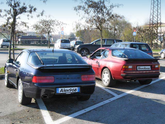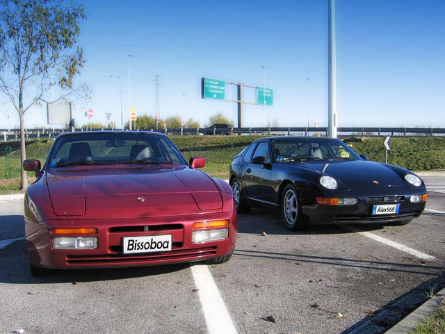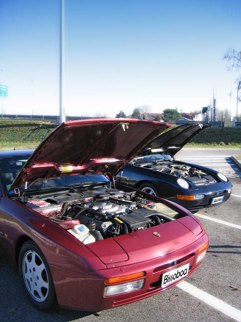 Oggi io e Stefano -Bissoboa- abbiamo approfittato della bella giornata per un primo incontro dei nostri missili, a farci compagnia due cari amici. Una pizza in un bel locale a metà strada e poi una breve corsa su per i Colli Berici fino al tramonto. Su consiglio di Stefano Pasini, come scrive sulla prova su strada della 968, volevamo poi brindare con un bicchiere di Gewurtztraminer fresco, ma la bassa temperatura ci ha fatto optare per una cioccolata calda con panna! Osservazioni: -la 951 di Stefano dal vivo è un mostro! Con quei passaruota allargati e le gomme maggiorate la vista posteriore è micidiale! Le foto non daranno mai giustizia all'impressione di forza e potenza che trasmette dal vero. L'affusolato musone dal design minimalista fa il resto. Il colore poi è molto bello, rendendola elegantemente sportiva. Il sound mi ha stupito, in ripresa sembrava di stare dietro ad una Carrera, wow! -Il confronto estetico con la mia 968 mi ha fatto riflettere molto; è proprio vero che le linee arrotondate e ingentilite della 968 nulla hanno a che vedere con l'originalità del disegno iniziale. Sarà che ormai ho fatto l'occhio, ma per quanto la 968 sia bella, rara, esotica ed esplicitamente sensuale, il disegno della 944 ne rimane il caposaldo. Vorrei capire, perchè con tutti gli sforzi non ci riesco, cosa passa per la testa di chi critica la linea di questa auto. Credo convintamente che a fine anni '80 la 944 fu una delle più belle auto stradali, perchè ancora oggi lo è! Ancora complimenti per la vettura Stefano!!! -Le prestazioni devo dire che più o meno si equivalgono, anche se la bruciante ripresa data dal turbo fa scattare la 951 in avanti con più forza, nonostante i rapporti più lunghi del cambio. -Girare in compagnia di una sorellina transaxle è bellissimo. La sua effige riflessa negli specchietti retrovisori è un optional che dovrebbe essere di serie, mentre la vista del posteriore in qualità di inseguitore fa credere di essere a Le Mans più che in una strada pubblica! (eh si, mi ha proprio colpito tanto il suo sedere!). A seguire qualche scatto fotografico della giornata.