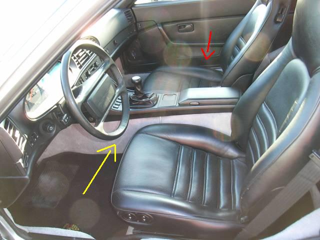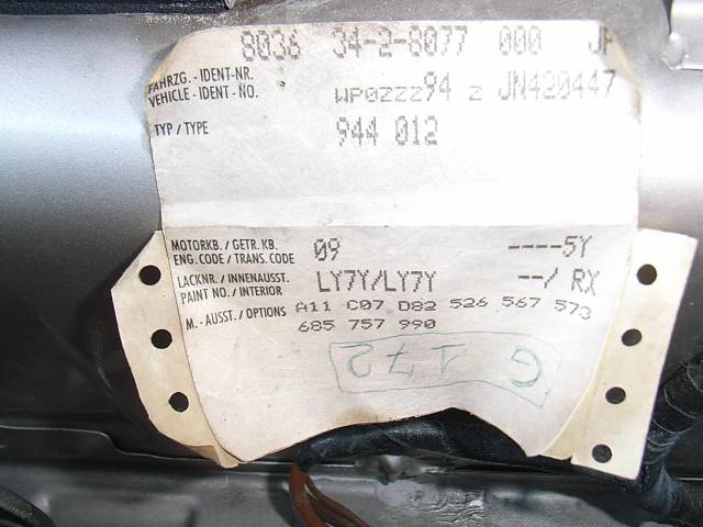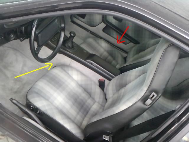 Eh sì, credo proprio si tratti di una 944 "Celebration Edition". Tetto apribile e profilo aerodinamico posteriore erano dettagli di serie per tutte le versioni commemorative (e giustamente non sono contemplati tra i codici delle opzioni riportati sulla targhetta). L'ABS credo fosse opzionale anche per questa versione speciale, a giudicare dai codici presenti sulla targhetta sembra quindi che l'auto non ne sia dotata (non è presente il codice 593). I sedili ed i panneli porta sono stati sostituiti quasi di sicuro, la moquette è originale (freccia gialla) ed è chiara come nelle versioni "Celebration", la parte bassa del pannello della portiera (freccia rossa) non è invece abbinato al resto della moquette, infatti, come si nota chiaramente dalla foto, è rivestito di moquette nera (probabilmente è stato sostituito l'intero pannello assieme ai sedili).