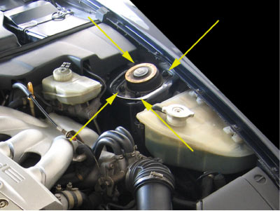 Roberto, la tua 968 Cabrio non è un taroccone per il semplice motivo che le modifiche apportate negli anni sono tutte reversibili. Ora ci vuole la volontà di ripristinare questi elementi. Io insisto per farlo, e nel lungo termine vedrai che mi darai ragione. Provo sempre una grandissima emozione quando controllo le varie viti di serraggio dei pannelli, di tutti gli accessori interni ed esterni e penso: quelle viti sono state serrate 17 anni fa dagli artigiani Porsche di Stoccarda, oppure la polvere depositata su certi anfratti e mai rimossa... Solo questo è un elemento di originalità che quando è perso non torna più! Comincio poi a vedere su certi esemplari pannelli sostituiti etc, staccati e poi riavvitati e rabbrividisco! Mi chiedo: ma perchè?! Ma sempre tutti elementi facilmente ripristinabili... In questa foto evidenzio i cappucci in plastica nera dei dadi degli ammortizzatori anteriori della mia 968: