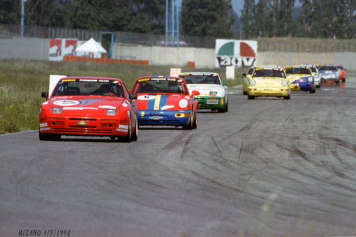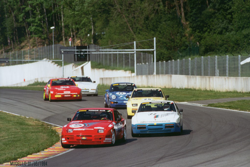 Ale non sbagli. Esaurito il campionato 944 tcup, sostituito dalle 964 cup, in tutta Europa si corsero Campionati variamente denominati in cui confluirono le 944tcup e poi le nuove 964 rs "pista". Il primo anno le 944 tcup corsero nella versione base senza kit france ed ebbero vita abbastanza facile, battagliando tra di loro, qui fotografata la mia che precede altre