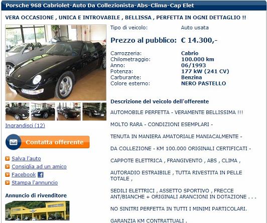 Maryo, secondo me devi cercare di capire veramente cosa vuoi e poi trovare una vettura in ordine. La 968 cabrio secondo me è vettura molto bella ed ancora usabile se in ordine. Pertanto se l'auto è sana (non ha subito incidenti) e meccanicamente in ordine a 14.000 euro è presa bene anche se devi mettere in conto per tua sicurezza un bel tagliando probabilmente anche con la distribuzione. Magari vanne a vedere un paio (e aggiungi alla visione una 944 cabrio che a mio avviso non è seconda per fascino). Ciao |