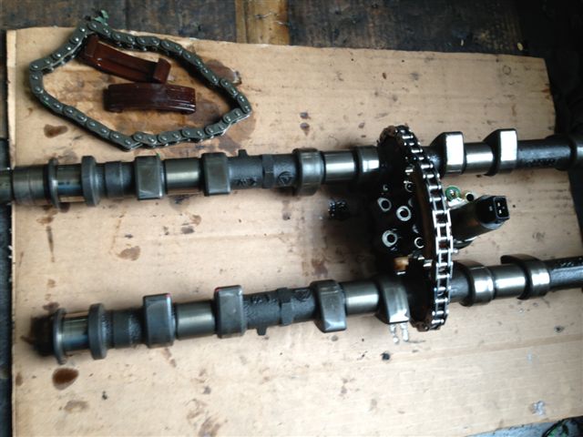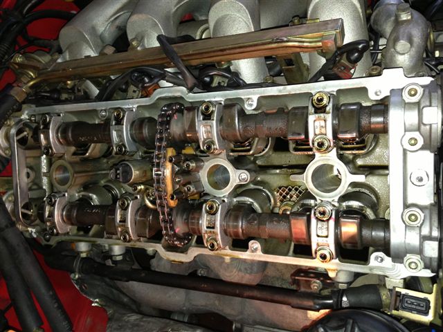 Nell'attesa che mi arrivino i Braking air inlets da Deutschnine abbiamo finito i lavori di meccanica. Incredibile il perfetto stato di tutto il motore nonostante l'utilizzo intenso ( però cambio olio ogni 3000 Km....). Abbiamo aperto il variocam e cammes ,catena e pattini erano PERFETTI!!!!Ho comunque sostituito catena e pattini. Fatto anche il lavoro della cinghia di distribuzione,tutti i cuscinetti,tenditore idraulico,cinghie,cinghiette etc ( un bel millino solo di pezzi......). Sostituiti olio motore,olio cambio,olio freni e filtro benzina. Sostituite le cuffie dei semiassi lato cambio che erano usurate. Alcune foto